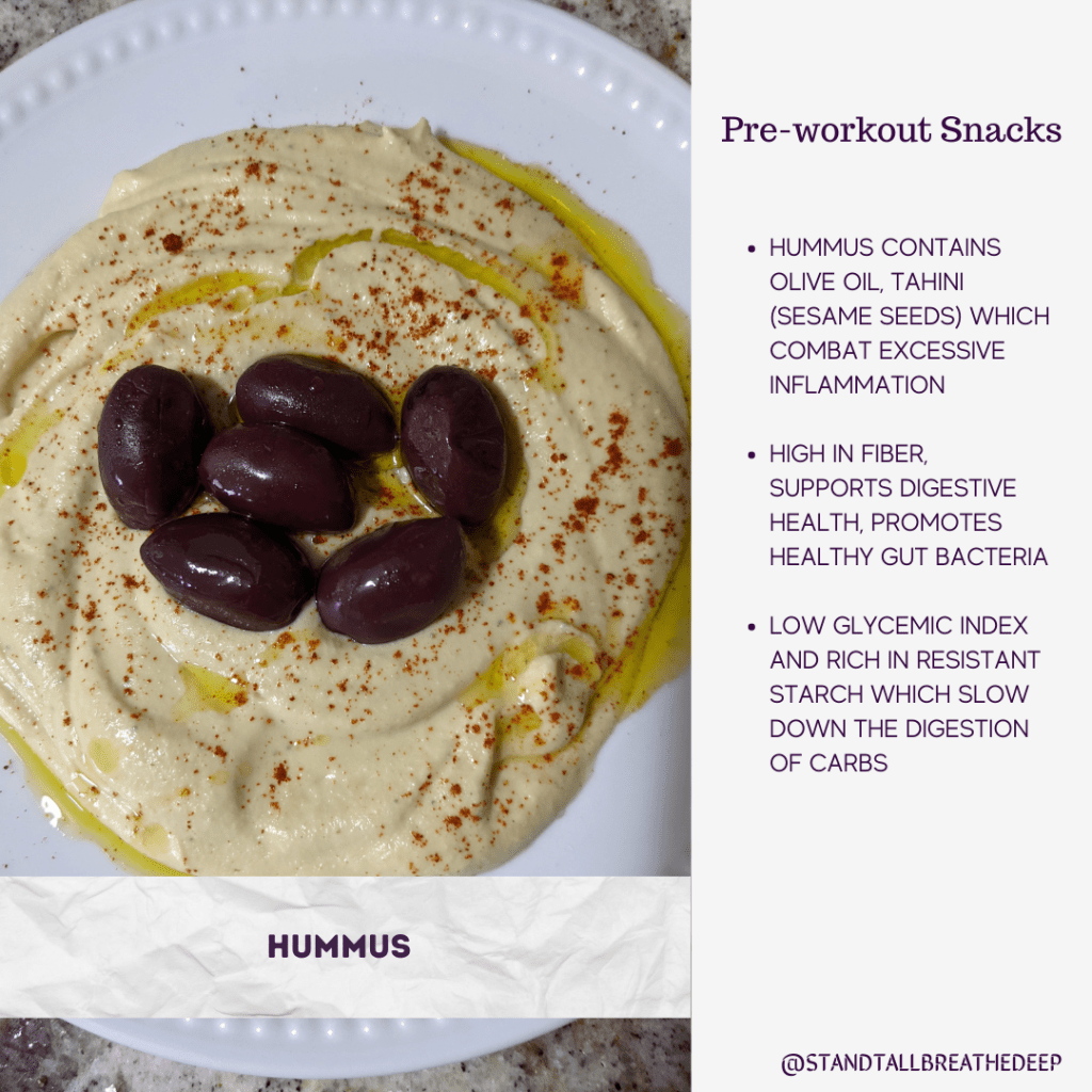 Hummus is a heavy hitter. It covers a lot of fronts that benefit our health and enhance our fitness efforts. It comprises complex carbs for sustained energy and protein to build and repair muscle damage.